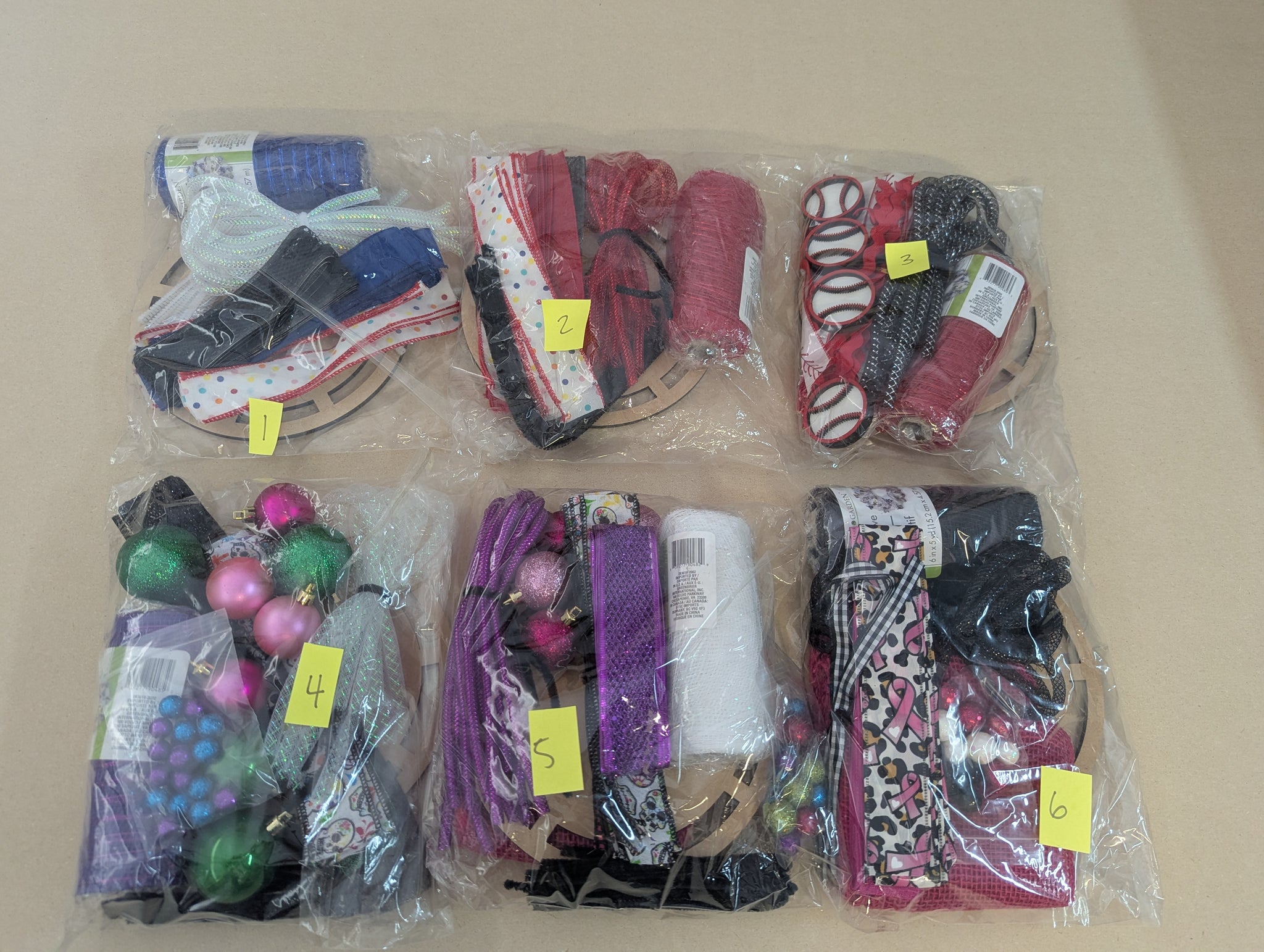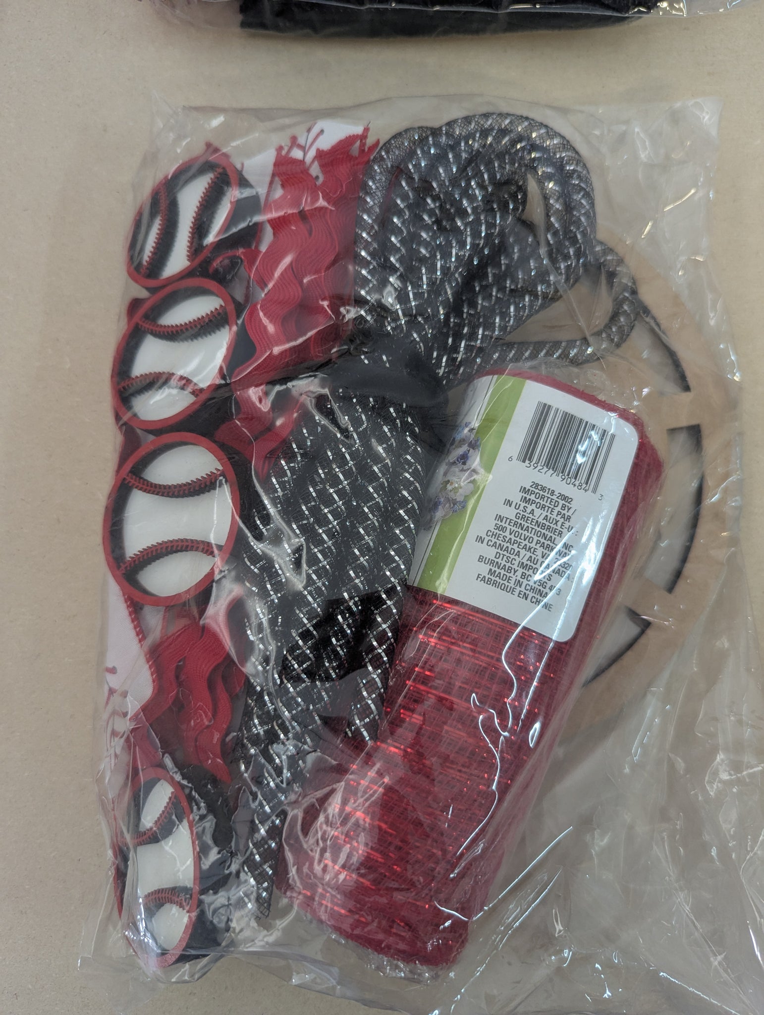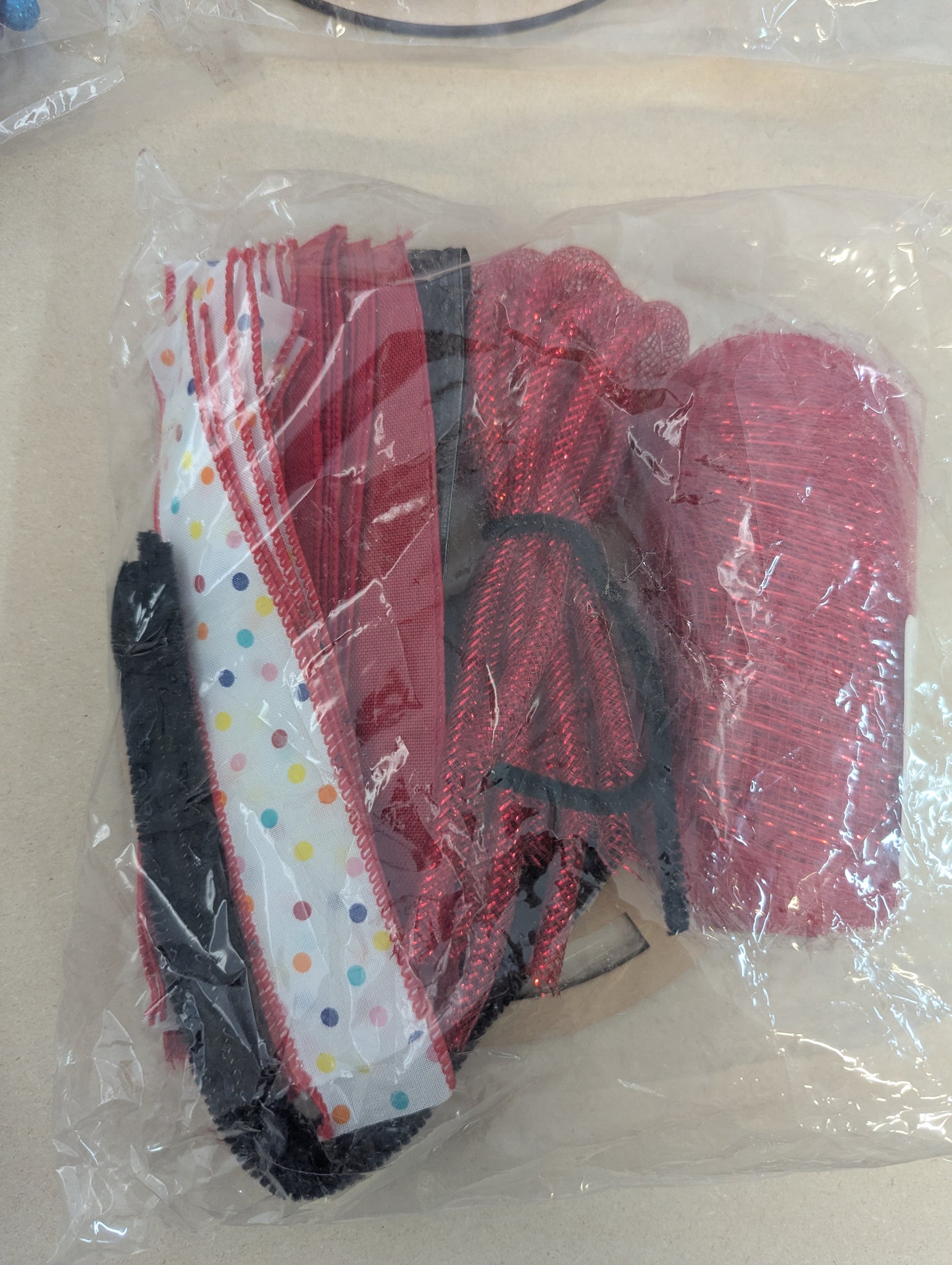 8" candle base, bundle of ribbon for tails, bundle of tubing, glitter balls, roll of mesh, pipe cleaners.