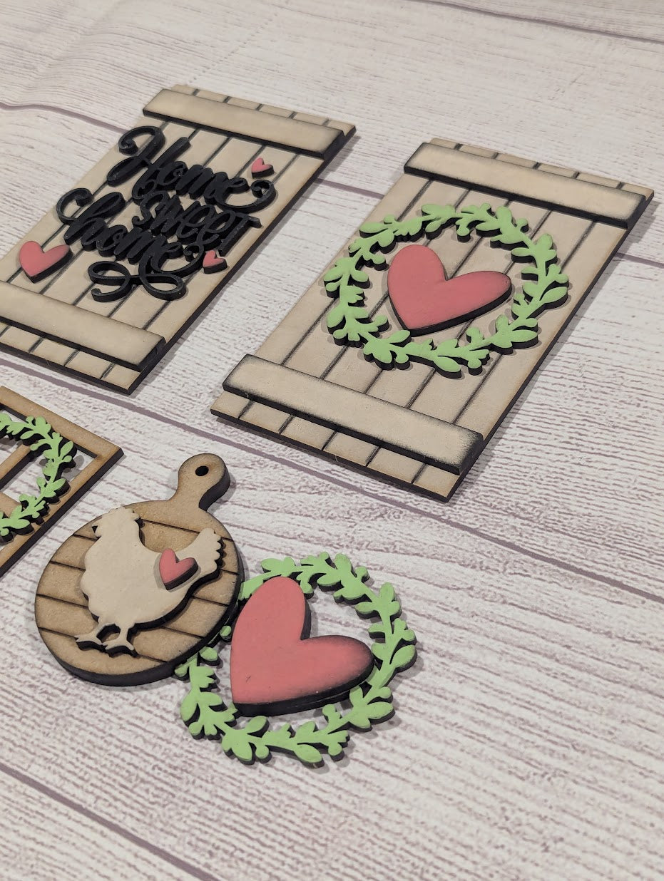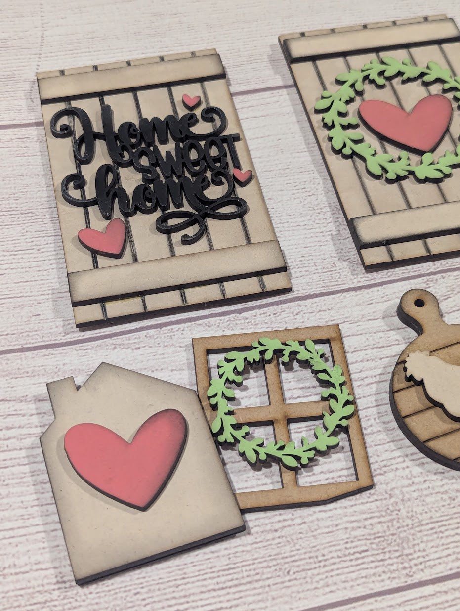 This Home sweet home set is for the Cottage Cabinet interchangeable base and is made from 1/8" MDF and comes unpainted and unassembled. BASE SOLD SEPARATELY